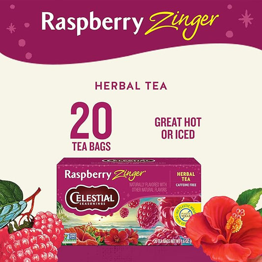 Celestial Seasonings Raspberry Zinger Herbal Tea, Caffeine Free, 20 Tea Bags Box