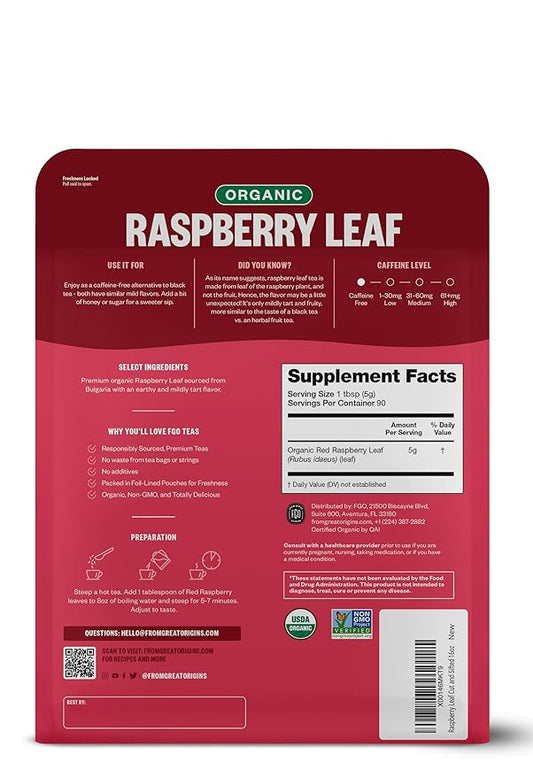 FGO Organic Red Raspberry Loose Leaf Herbal Tea, Cut and Sifted, Caffeine Free, 16oz Bulk Resealable Pouch, Packaging May Vary (Pack of 1)