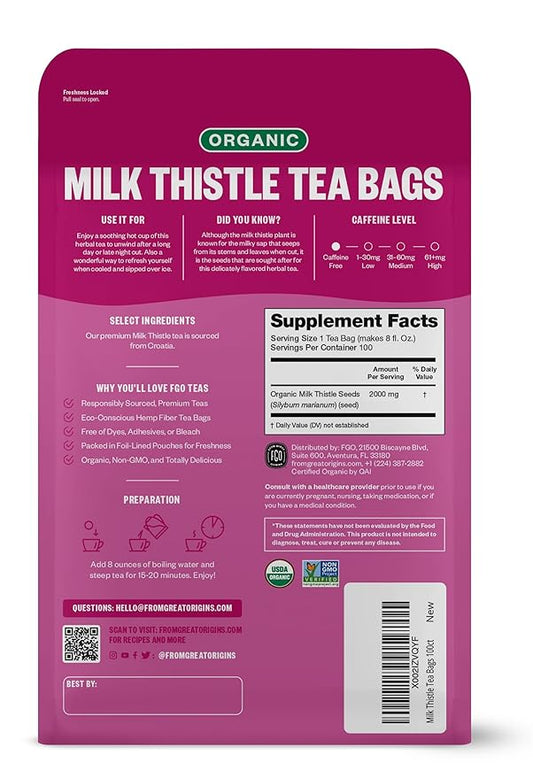 FGO Organic Milk Thistle Tea, 100 Count, Eco-Conscious Herbal Tea Bags, Resealable Bag, Caffeine Free, Packaging May Vary (Pack of 1)