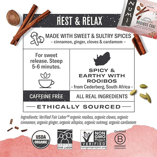 Numi Organic Rooibos Tea Variety Pack, 18 Tea Bags (Pack of 3), Chocolate Rooibos, Rooibos Chai, Rooibos (Packaging May Vary)