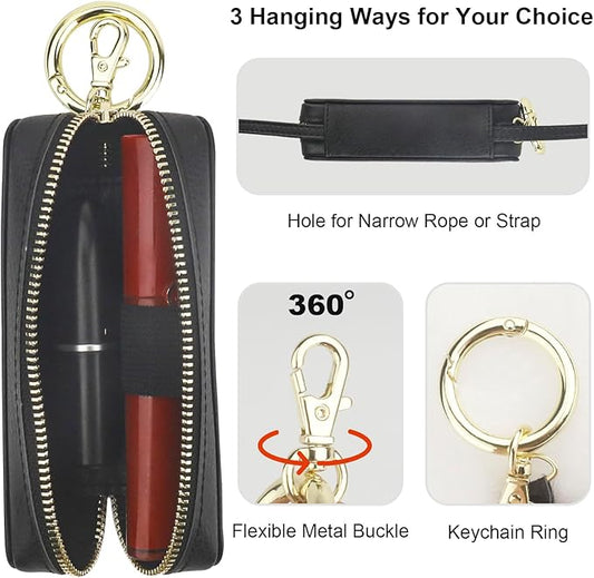 Bocasal Leather Lipstick Case Holder Chapstick Keychain Pouch, Zipper Lip Balm Lip Gloss Bag for Purse with Key Chain Elastic Band, Makeup Travel Organizer Cosmetic Storage Kit for Women Girls (Black)