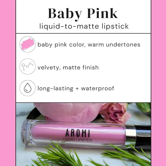 Aromi Baby Pink Matte Liquid Lipstick, Light Pink Lip Color, Smudge Proof, Waterproof, and Long-lasting Lipstick, Vegan and Cruelty-free, Handmade (Baby Pink)