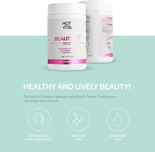 Hot Vita Beauty Supplement Pills – Anti-Aging Supplement Treatment for Hair Loss, Skin, and Nails with Collagen, Biotin, Magnesium, Vitamin C and Hyaluronic Acid