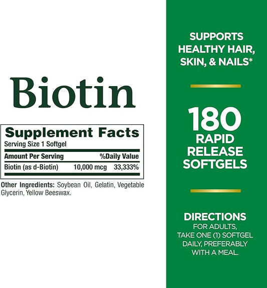 Nature's Bounty Biotin, Supports Healthy Hair, Skin and Nails, 10,000 mcg, Rapid Release Softgels, 180 Ct