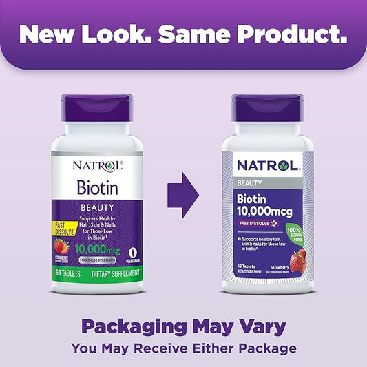 Natrol Biotin 10000mcg, 4x Faster Dissolve Supplement for Healthy Hair, Skin and Nails for Those Low in Biotin, Plus Energy Metabolism Support, 60 Tablets, Up to a 60 Day Supply