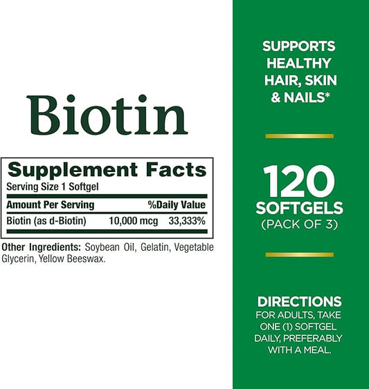 Nature's Bounty Biotin Hair Skin and Nails Vitamins, Supports Healthy Hair, Skin and Nails, 10,000 mcg, 120 Softgels (Pack of 1)
