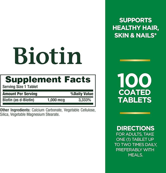 Biotin by Nature's Bounty, Vitamin Supplement, Supports Metabolism for Cellular Energy and Healthy Hair, Skin, and Nails, 1000 mcg, 100 Tablets