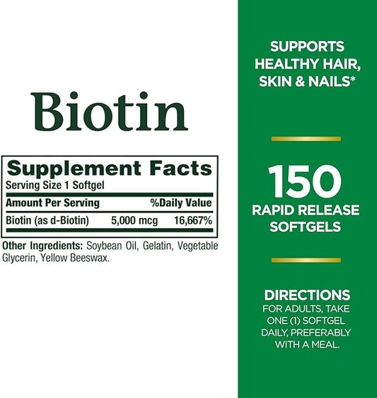 Nature's Bounty Biotin, Vitamin Supplement, Supports Metabolism for Cellular Energy and Healthy Hair, Skin, and Nails, 5000 mcg, 150 Softgels
