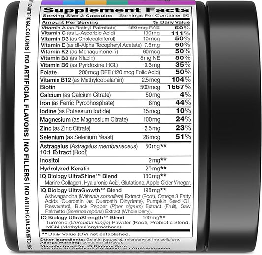 Biotin with Hyaluronic Acid, Collagen and Keratin – 25000 mcg Hair Growth Vitamins for Men and Women – Nails and Skin, USA Made - Third Party Tested, B1, B2, B3, B6, B7 Complex - 60 Capsules
