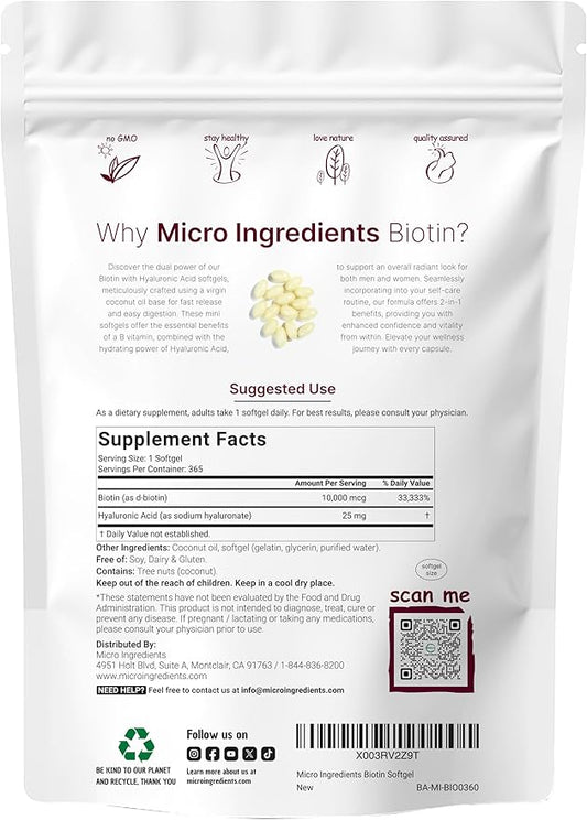 Micro Ingredients Biotin 10,000mcg w/Hyaluronic Acid 25mg | 365 Virgin Coconut Oil Softgels, Fast Release, One Year Supply, Supports Healthy Hair, Skin & Nails, Non-GMO & No Gluten