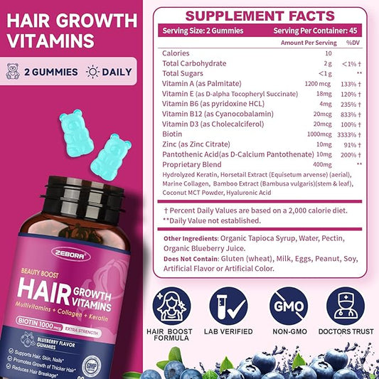 Biotin Gummies for Hair Skin and Nails -Hair Vitamins with Biotin, Zinc, Vitamin A, B6, B12, D3 & More - Support Healthy Skin, Hair Growth, Stronger Nails for Women and Men - 90 Blueberry Gummies