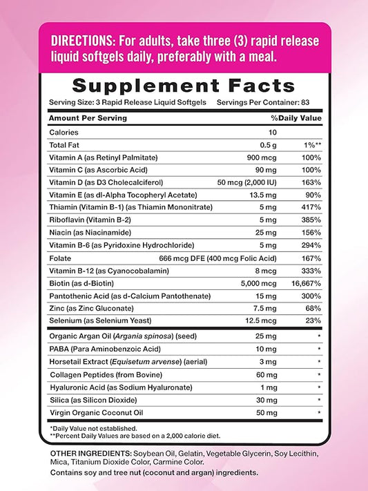 Hair, Skin & Nails Vitamins for Women - Biotin 5000mcg to Support Hair Growth with Argan Oil, Collagen & Hyaluronic Acid, Beautiful, Stronger Skin, Hair & Nails Vitamin Supplement - 60 Softgels