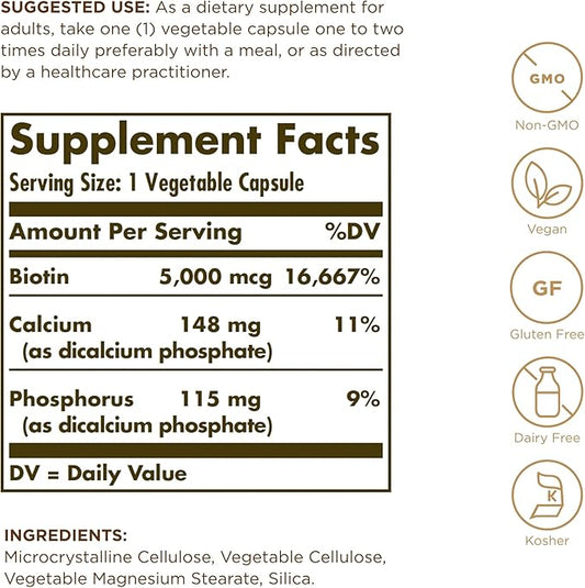 SOLGAR Biotin 5000 mcg - 100 Vegetable Capsules - Supports Healthy Skin, Nails & Hair - Non-GMO, Vegan, Gluten Free, Dairy Free, Kosher - 100 Servings