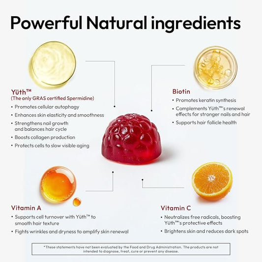 BIGVITA Yuth Gummies + | Spermidine Gummies for Hair Growth, Skin & Nails | High-Purity Spermidine Supplement for Cellular Renewal & Anti-Aging | Collagen Support with Vitamin C & Vitamin A
