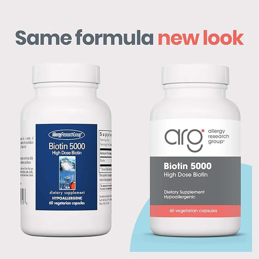 Allergy Research Group Biotin 5000 Supplement - 5000mcg Biotin, Vitamins for Hair, Skin and Nails, High Dose, Vegetarian Capsules, Hypoallergenic, Gluten Free - 60 Count