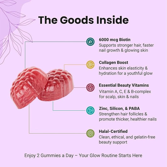 Halal Certified Hair, Skin, & Nails Gummies - Packed with Biotin, Collagen, Folate, & Essential Beauty Vitamins for Strong Hair, Glowing Skin & Healthy Nails - Easy Digestion & High Absorption - 60 ct