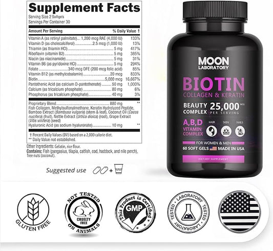 Premium Biotin 5,000 mcg Beauty Complex with Collagen, Keratin, Hyaluronic Acid, Vitamin A, D3, B-Complex, Calcuim & Coconut Oil. Hair Growth, Nails, Skin. For Men & Women. 60 Softgels