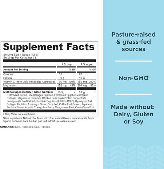 Ancient Nutrition Collagen Powder Protein, Multi Collagen Protein Beauty + Sleep with Vitamin C, Vanilla Chai, Hydrolyzed Collagen Peptides Supports Skin and Nails, Sleep, 16.1oz
