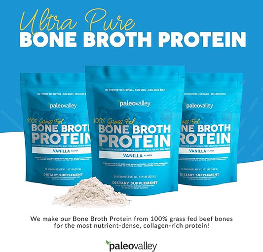Paleovalley 100% Grass Fed Bone Broth Protein Powder - Vanilla - Rich in Collagen for Hair, Skin, Gut Health, Bone and Joint Support - 28 Servings