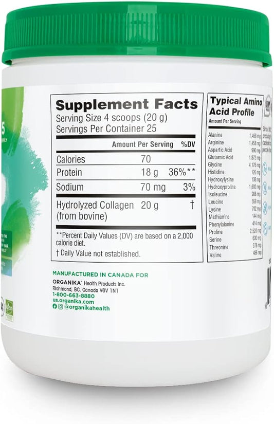Organika Enhanced Hydrolyzed Collagen Peptides Powder: Easy Absorption Unflavored Collagen Powder for Skin, Hair, Nails, Joints, Muscles, & Gut - Keto, GMO-Free, Grass-Fed - 25 Day Supply
