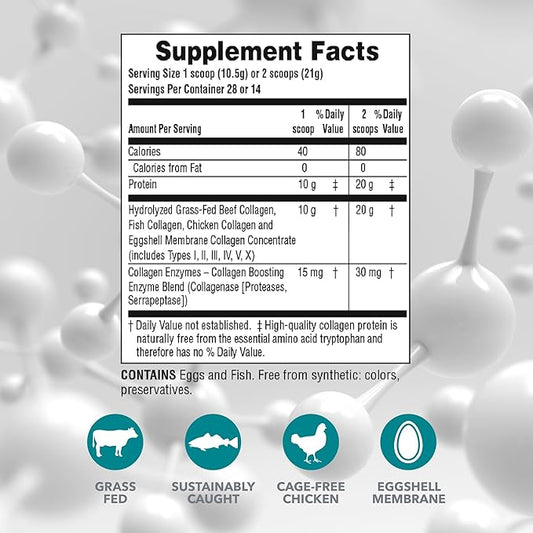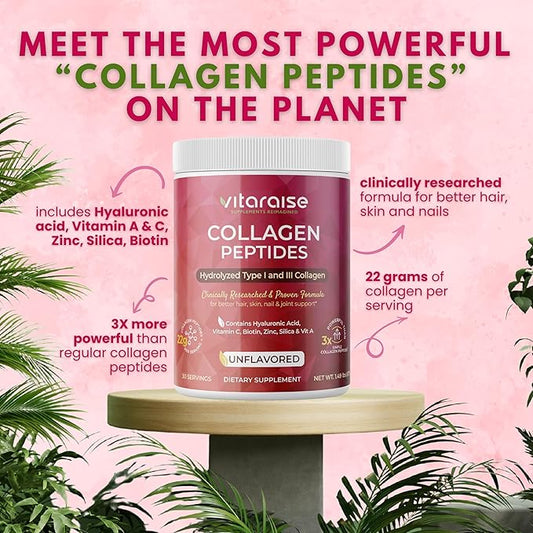 Hydrolyzed Collagen Powder - Type I & III Grass-Fed Collagen for Hair, Skin, Nail, Joints - Unflavored 22g per Serving - 30 Servings - 1.49 lbs - 3X Powerful - Hyaluronic Acid, VIT C, Added Nutrients