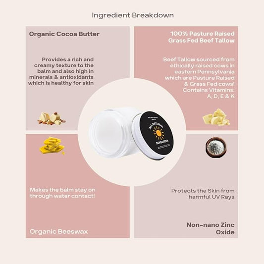Beef Tallow & Zinc Sunblock | Tallow Sunscreen SPF 35 (2oz) | Reef Safe, Water Resistant | Beef Tallow for Skin, Tallow Face Moisturizer | Organic 100% Grass Fed Tallow, Zinc Oxide