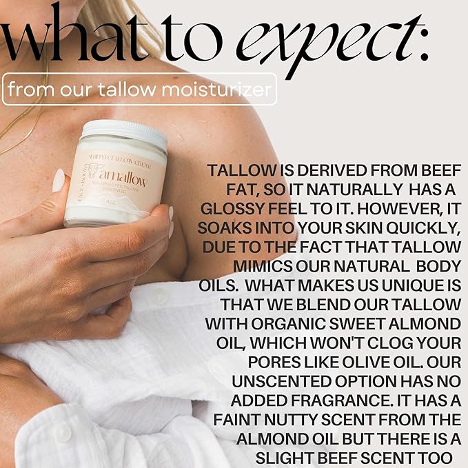 - Made With Sweet Almond Oil & Organic Essential Oils: Most tallow lotions are made with olive oil, which has been proven to clog pores. Our formulation contains sweet almond oil which does not clog pores and has countless benefits for your skin.