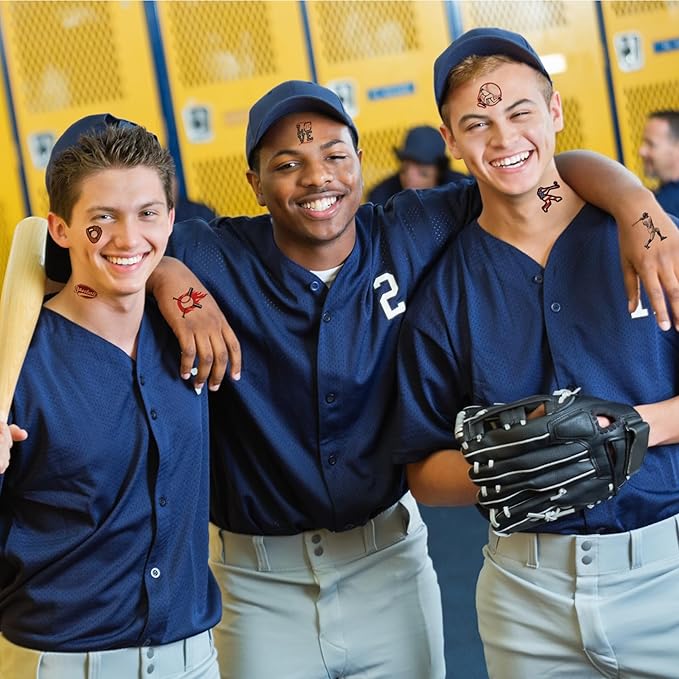 - ⚾【Baseball Temporary Tattoos】Our Baseball temporary tattoos set includes 100 pieces with a variety of designs such as baseballs, players, bats, caps, gloves, scoreboards, game words, hearts, trophies, crowns, and more!