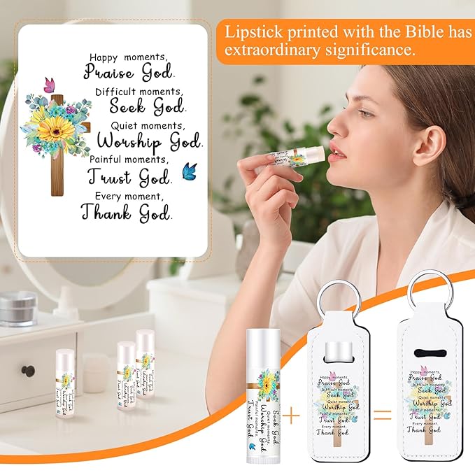 - Package Includes: you will love a bundle of fun bible gifts set come in abundant sets of 18 lip balms, which are mint flavors, and 18 lip gloss keychain holders; The lip balms are not only sleek but also designed with the bible theme to make it more appealing; Accompanied by the same number of lipstick holders, you are set with the ideal package to groom and maintain your lip moist