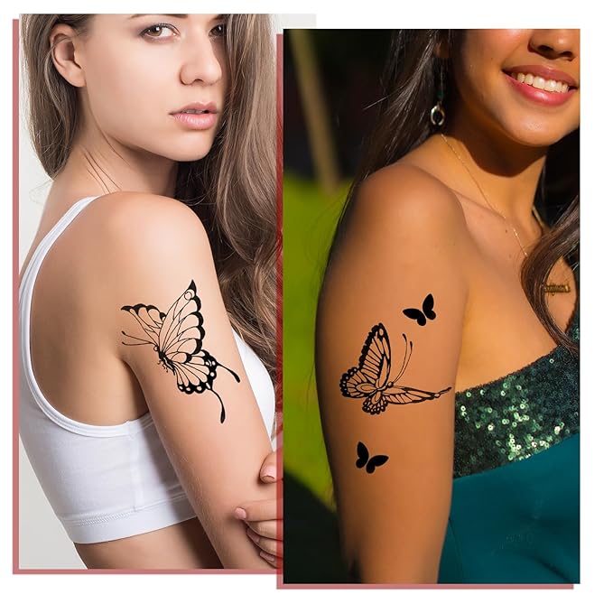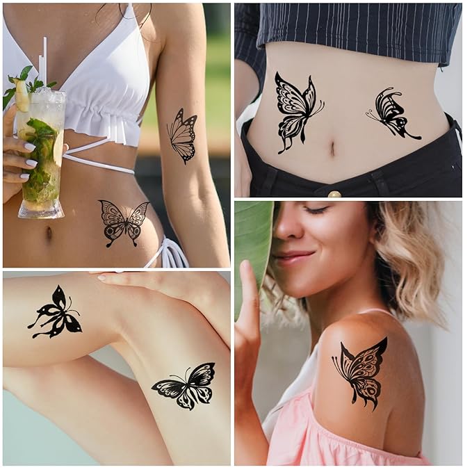 - Widely used: The black butterfly temporary tattoo can be attached to your body, such as arms, legs, neck, shoulders, wrists, etc., as well as other flat and smooth places, such as walls, bottles, tables, etc. Black butterfly temporary tattoo is perfect for party favors and daily use, party, holiday beach, music festival, wedding or any occasion to make the most of you.