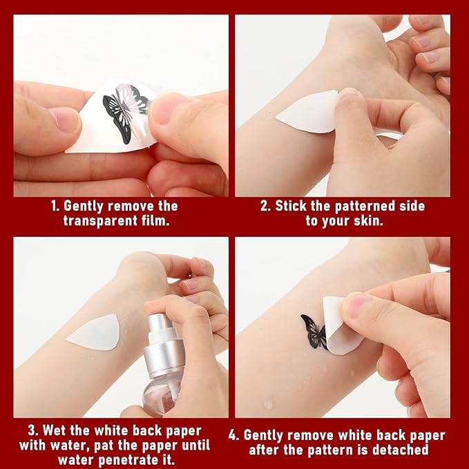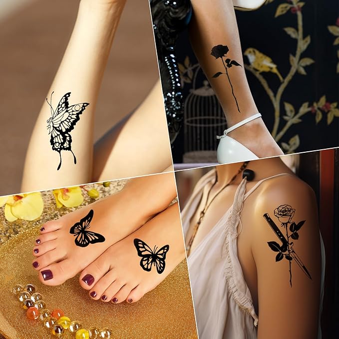 - Reliable materials: The black butterfly temporary tattoo is made of reliable materials, with good adhesion, waterproof and durable, gentle and friendly to the skin, bright colors, realistic patterns, rich styles, and can be used many times. Flower temporary tattoo stickers can last 3 to 5 days on your body and are easy to use so you can have stunning results. Additionally, temporary tattoos can be easily removed by rubbing them with olive oil, allowing you to return to your original appearance.