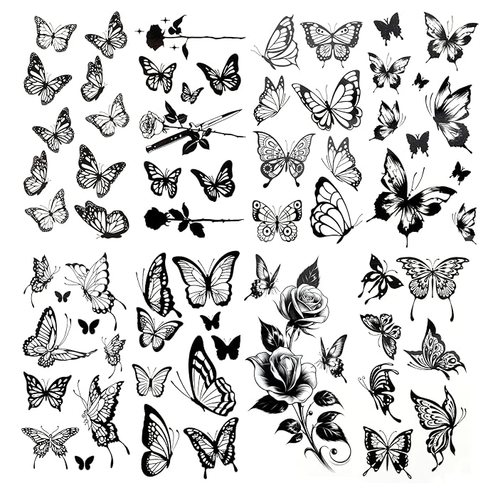 - You will get: 8 black butterfly temporary tattoos, the entire flower temporary tattoo sticker size is 21*9.8cm/8.26*3.85inch. With sufficient quantities and complete varieties, you can use these realistic small flower temporary tattoo stickers on arms, shoulders, back, chest, legs, neck and any part of the body to become a dazzling presence in the crowd.