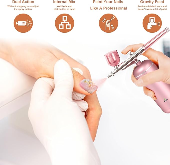 - 💅【Upgraded Airbrush Kit with Compressor】Our airbrush kit features a rechargeable battery that provides over 60 minutes of continuous use. Easily charge it via USB with a power bank, laptop, or any USB charger (Type-C). The cordless airbrush body includes an indicator light to show battery power, allowing you to unleash your artistic skills wherever you are. Note: Please use a 5V/1A or 5V/2A adapter to avoid damaging the battery.