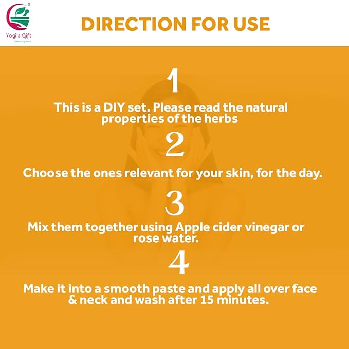 - ★ 𝗛𝗢𝗪 𝗧𝗢 𝗨𝗦𝗘: This is a DIY set. Please read the natural properties of the herbs and choose the ones relevant for your skin, for the day. Mix them together using Apple cider vinegar or rose water. Make it into a smooth paste and apply all over face & neck. Wash after 15 minutes