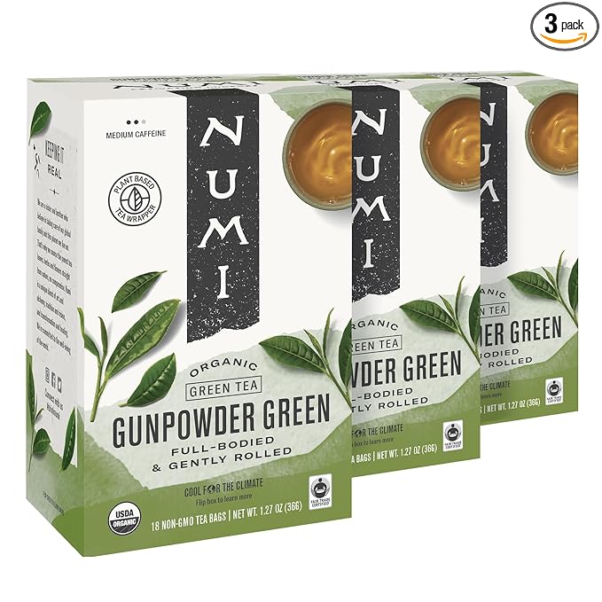 Numi Organic Tea Gunpowder Green, 18 Tea Bags (Pack of 3), Full-Bodied Gently Rolled Chinese Green Tea (Packaging May Vary)