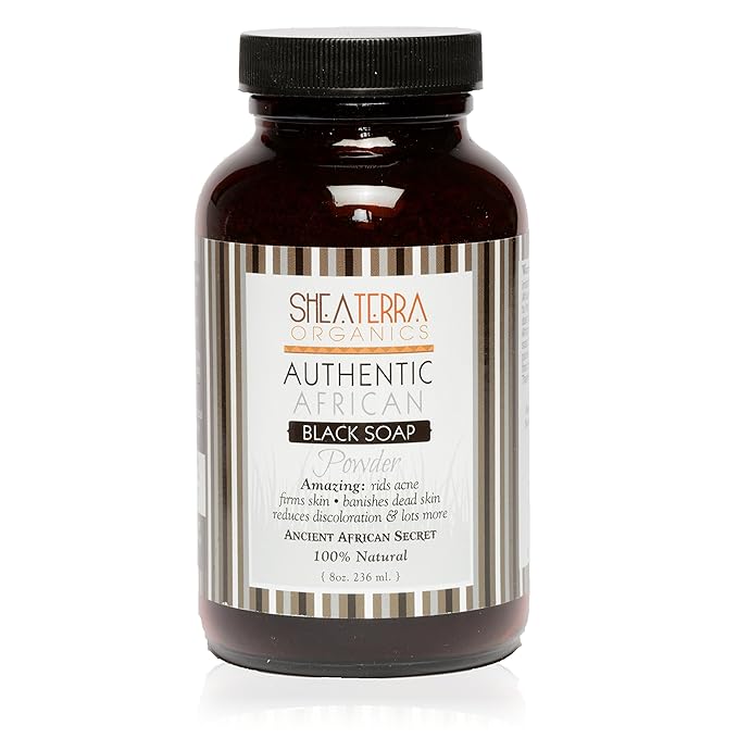 Shea Terra Organics African Black Soap Powder | Natural Skin Care for Acne, Eczema, Dry Skin, Psoriasis, Wrinkles, and More - Home Spa Treatment Full Body Wash - 8 oz