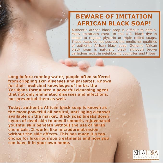 - Made from Pure Authentic African Black Soap: No dyes or activated charcoal, only real and raw African black soap made from the ashes of plantain peels, cocoa pods, camwood and palm kernels roasted in clay ovens.