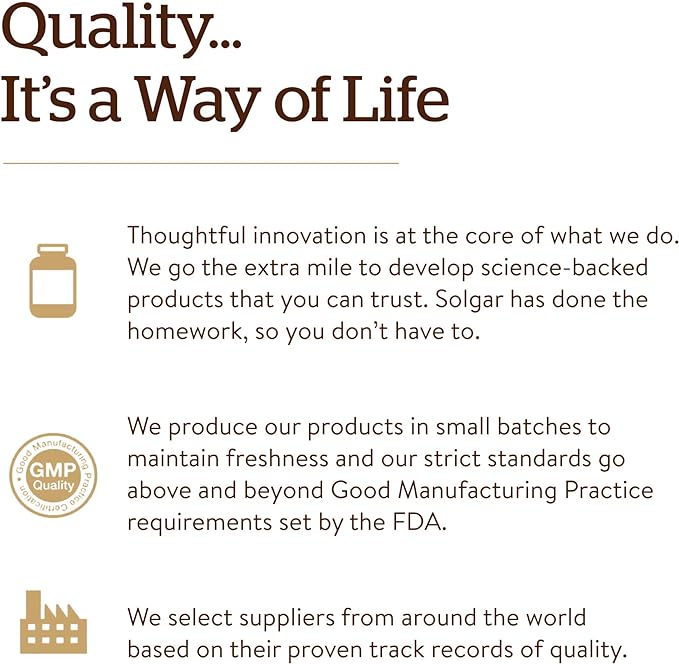 - The Gold Standard: For over 70 years, Solgar has been committed to quality, health, and well-being. Our mission is to create the finest nutritional supplements in small batches, through tireless research, using only the finest raw materials
