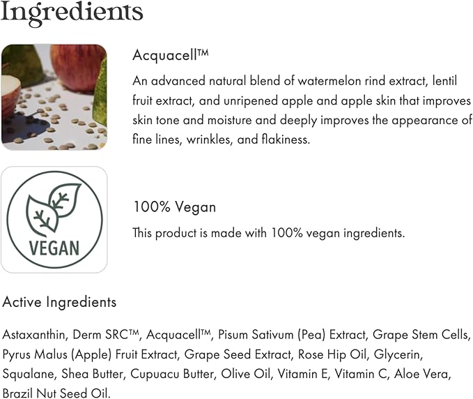 - Active Ingredients : vitamin_c, vitamin_e, Astaxanthin, Derm SRC™, Acquacell™, Pisum Sativum (Pea) Extract, Grape Stem Cells, Pyrus Malus (Apple) Fruit Extract, Grape Seed Extract, Rose Hip Oil, Glycerin, Squalane, Shea Butter, Cupuacu Butter, Olive Oil, Vitamin E, Vitamin C, Aloe Vera, Brazil Nut Seed Oil. vitamin_c, vitamin_e, Astaxanthin, Derm SRC™, Acquacell™, Pisum Sativum (Pea) Extract, Grape Stem Cells, Pyrus Malus (Apple) Fruit Extract, Gr… See more