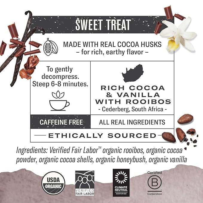- TRADITIONAL SOUTH AFRICAN HERBAL TEA--Smooth South African rooibos is enveloped by sweet honeybush and rich cocoa. A naturally sweet, soothing chocolate tea that will melt away your stress with every sip.