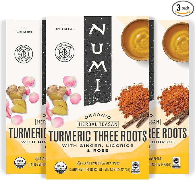 Numi Organic Three Roots Turmeric Tea, 12 Tea Bags (Pack of 3) With Ginger, Licorice, Rose, Caffeine Free, Packaging May Vary