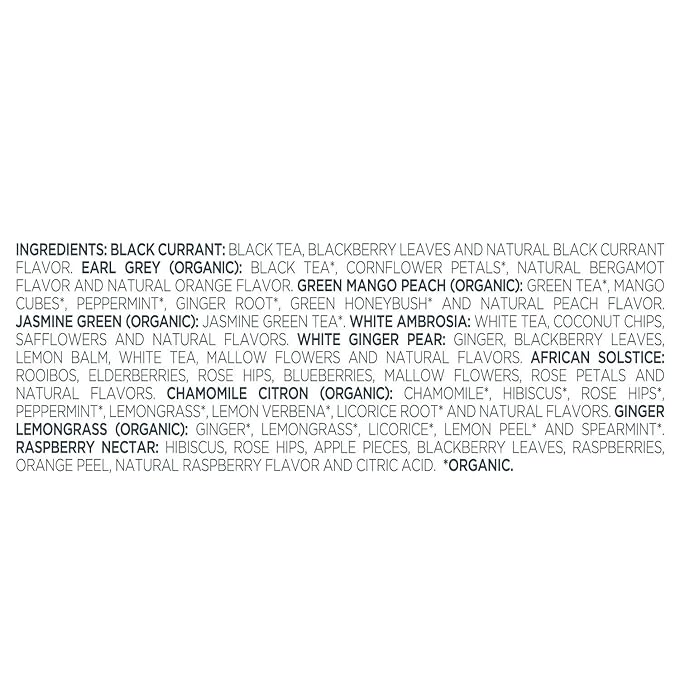 - TEA TASTING ASSORTMENT with ten varieties of our most popular flavored tea blends - African Solstice (herbal tea), Black Currant (black tea), Chamomile Citron (herbal tea), Earl Grey (black tea), Ginger Lemongrass (herbal tea), Green Mango Peach (green tea), Jasmine Green (green tea), Raspberry Nectar (herbal tea), White Ambrosia (white tea), and White Ginger Pear (white tea)