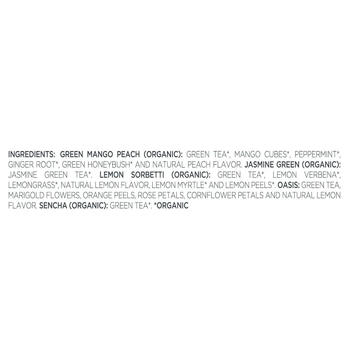 - GREEN TEA ASSORTMENT with the finest quality green tea leaves, blended with fruits, flowers and herbs: Green Mango Peach, Jasmine green, Lemon Sorbetti, Oasis and Sencha