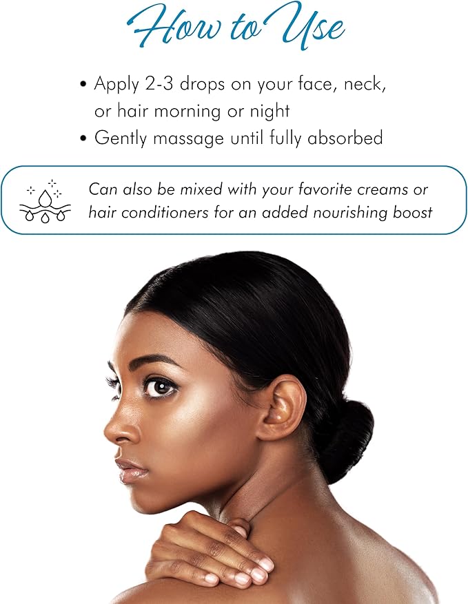 - Apply 2-3 drops on your face, neck, or hair as part of your morning or night routine. Gently massage until fully absorbed. It can also be mixed with your favorite creams or hair conditioners for an added nourishing boost.