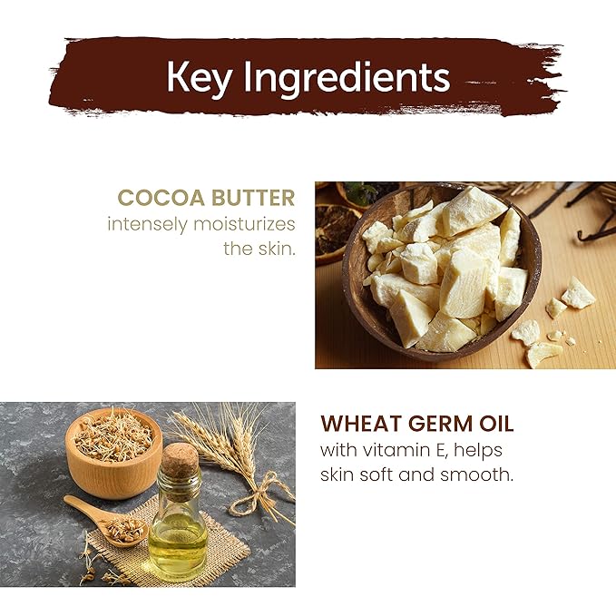- WITH COCOA BUTTER & WHEAT GERM: To replenish lost moisture and Vitamin E, helping restore skin elasticity for healthy-looking skin.