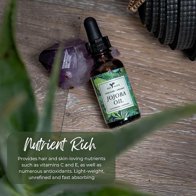 - NUTRIENT-RICH, CLEAN INGREDIENTS: This unique Jojoba Oil, brought to you by Baja Basics, is specially formulated from organic, cold-pressed, unrefined jojoba oil. We took special care to select clean and gentle, ingredients while leaving out parabens and other harmful chemicals so you would receive a top-quality product. This product is also vegan and cruelty-free. Jojoba oil provides hair and skin-loving nutrients such as vitamins C and E as well as numerous antioxidants