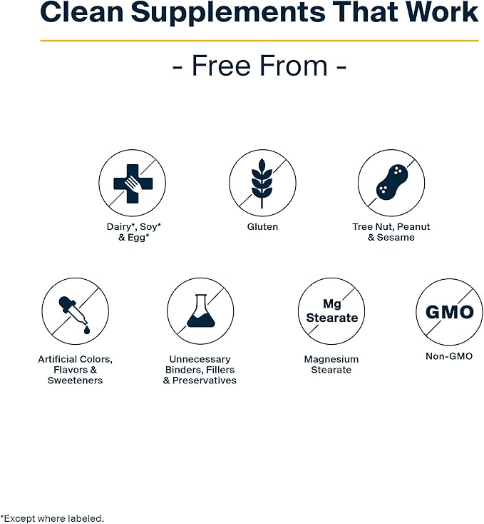 - Clean Formula: Free from gluten, dairy, peanut, tree nut, shellfish, soy, sesame, and egg Non-GMO Made without artificial fillers, coatings, binders, or colors
