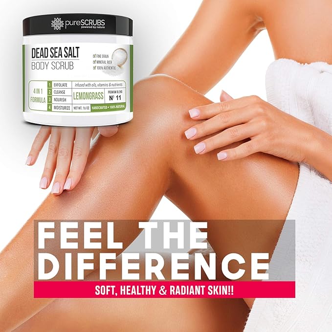 - GET ULTRA SMOOTH SKIN FAST - THIS WORKS! Our unique “4 in 1 Formula” does everything a body scrub should do and more - EXFOLIATE, CLEANSE, NOURISH & MOISTURIZE. Fine grain dead sea salt infused with essential oils, nutrients and skin softeners helps to smooth away rough, bumpy, and uneven textures to instantly reveal your true soft, healthy and radiant skin. You'll love the lemongrass aroma!