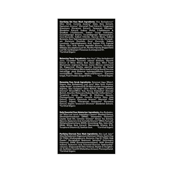 - Key Ingredients: Natural & Certified Organic ingredients, including aloe, caffeine, DMAE, MSM, protein peptides, hyaluronic acid, coconut cleansers, pumice, jojoba beads and green tea.
