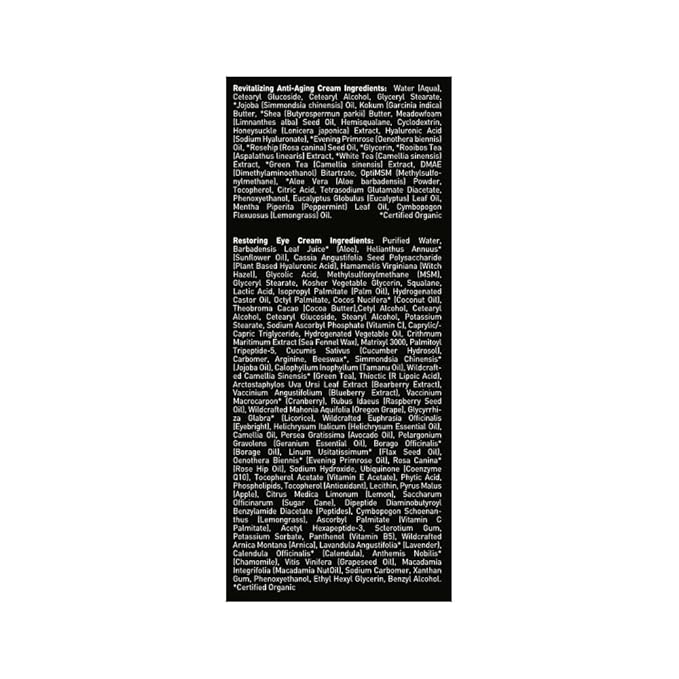 - Key Ingredients: Natural & Certified Organic ingredients, including aloe, caffeine, DMAE, MSM, protein peptides, hyaluronic acid, coconut cleansers, pumice, jojoba beads and green tea.